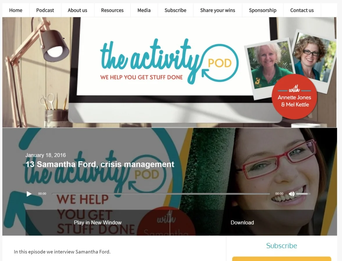 What a fantastic experience being interviewed for the Activity Pod, episode 13, crisis management by the wonderful Mel Kettle and Annette Jones. Thank you so much for the opportunity and excellent conversation.