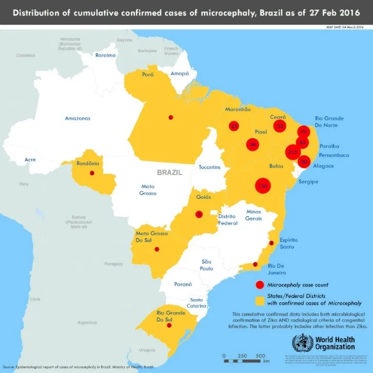 By February 2016, there were a total of 641 confirmed cases of microcephaly and 1708 confirmed cases of GBS. However, over 4000 suspected microcephaly cases remain under investigation. Due to the increasing magnitude of the disease, Brazil has stopped counting cases of Zika[3].